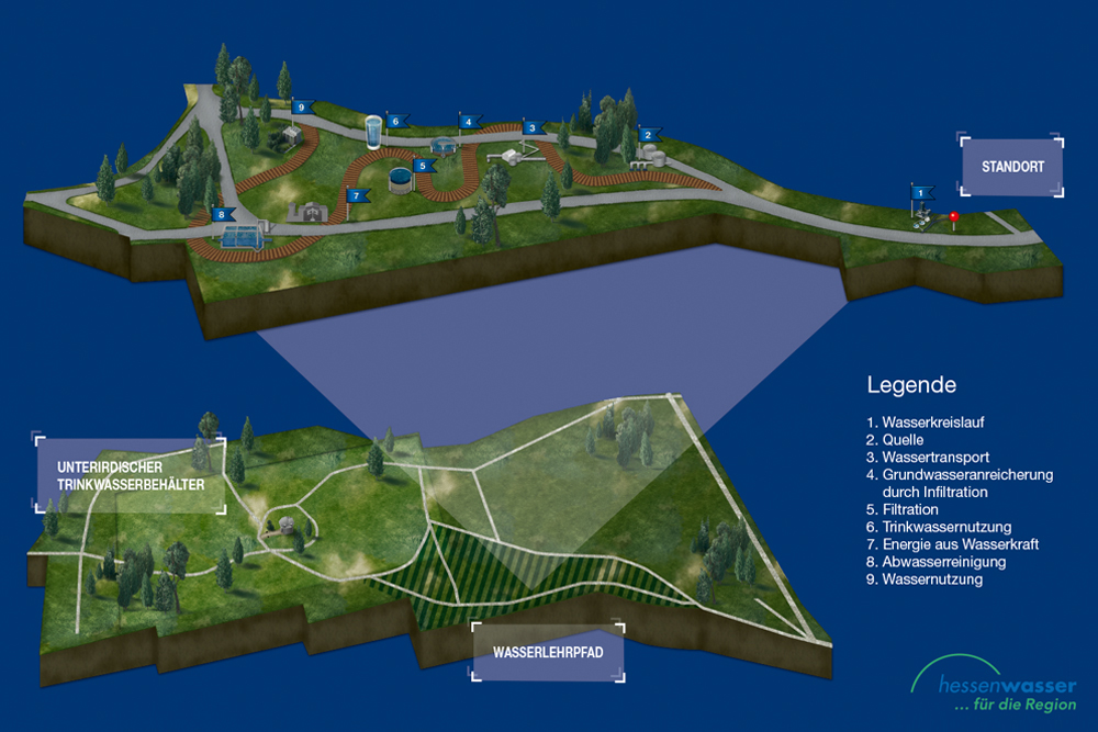 Visualisierung des Wasser-Weges, anhand der 9 Stationen des Wasserparks.