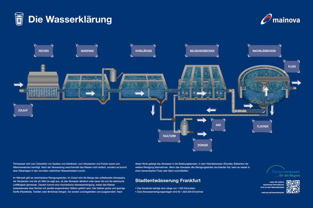 Mit Hilfe das Wasserlehrpfads wird im Wasserpark der Mainova der Weg des Wassers erklärt. Der Besucher durchläuft 9 Stationen (Bild 1) und entdeckt spielerisch alles Wesentliche zum Thema. Zum Beispiel zur Filtration (Bild 2) oder der Wasserklärung (Bild 3).